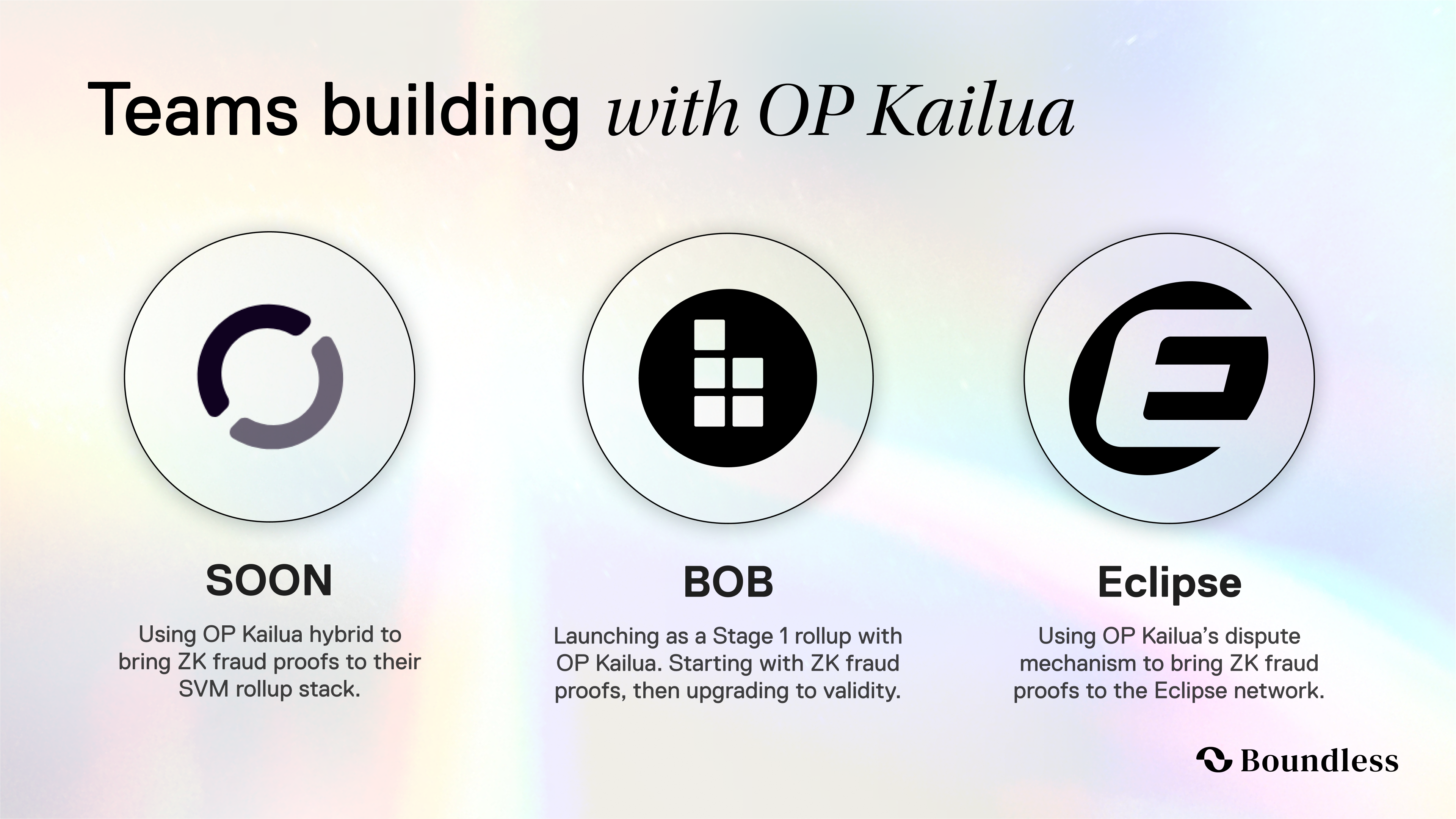 SOON is building an SVM (Solana Virtual Machine) Rollup Stack so any chain can tap Solana-class performance. Kailua Hybrid handles the fraud-proof layer: a single ZK proof replaces week-long disputes, bringing SOON chains down to ~three-hour finality. As usage grows, SOON can toggle to Kailua Validity and settle in under an hour: no migrations, no downtime, just a faster Solana-style world on every L1.